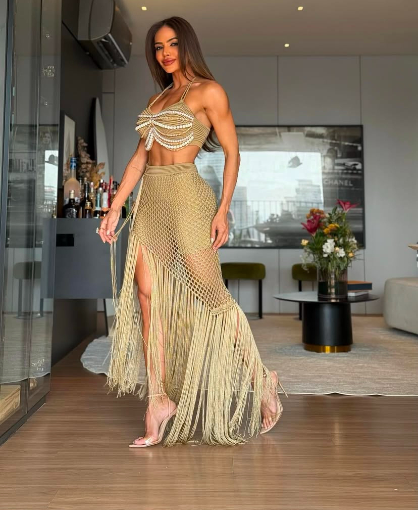 Confeccionado no fio rayon, o modelo traz um top moderno com detalhe em recortes e uma saia em renda com franjas que garantem leveza e movimento.