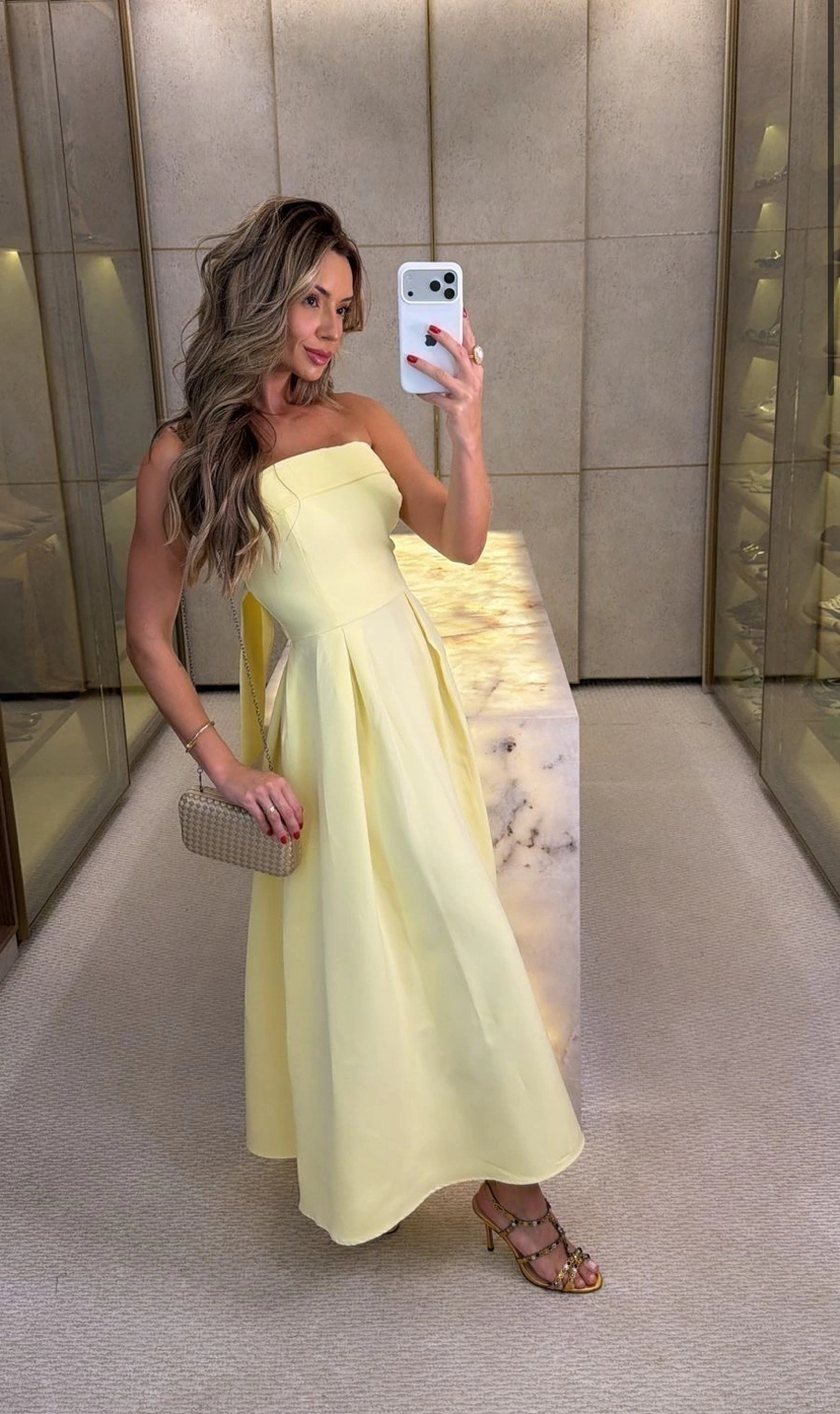 Um vestido que vai te deixar parecendo uma princesa! Ele é tomara que caia, com elástico e amarração atrás, com a saia soltinha trazendo leveza. Possui bojo. É em crepe, composição 100% poliéster.